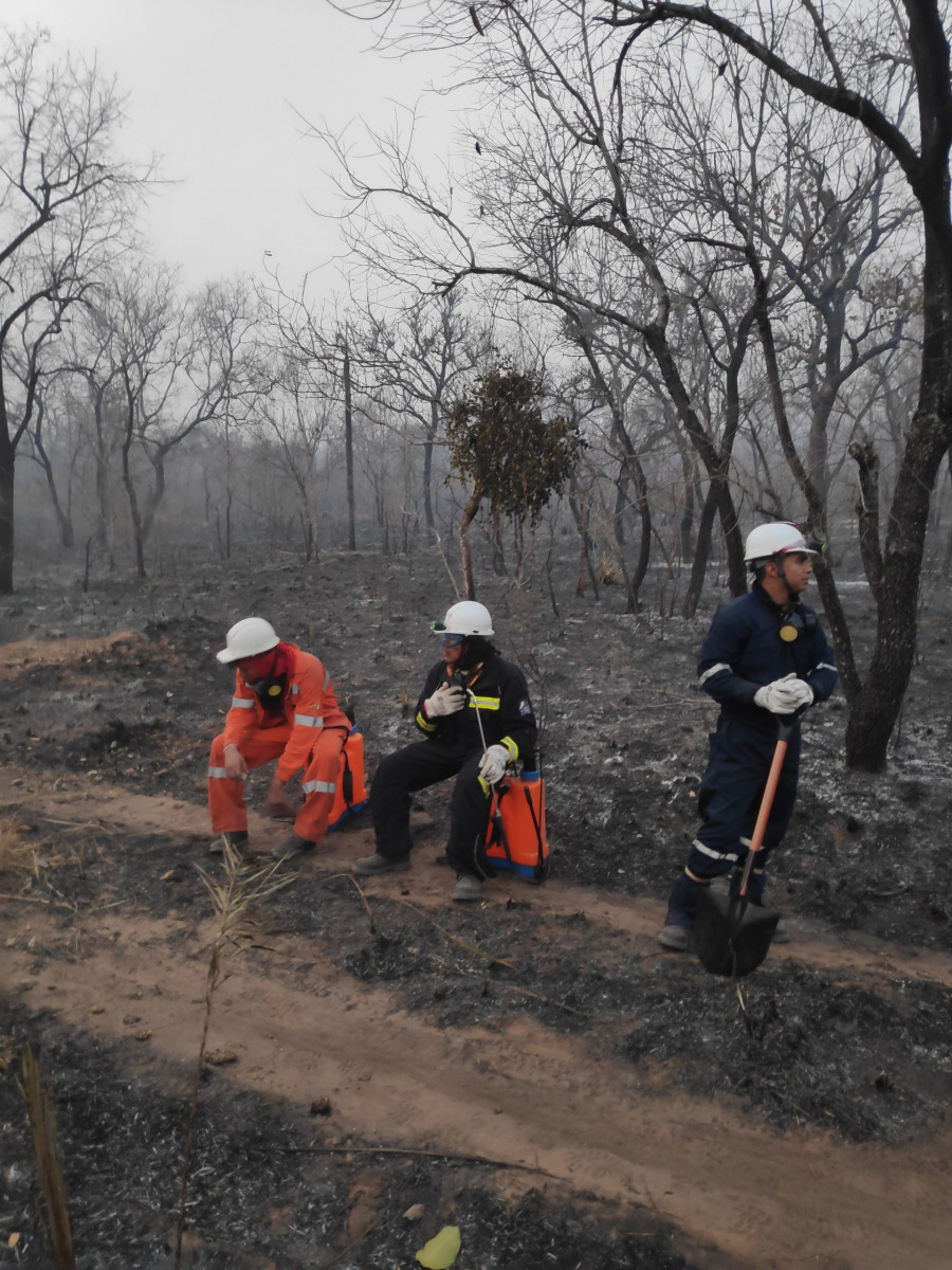 Al llegar a Concepción, donde se encontraba nuestro campamento, nos pusimos a trabajar de inmediato. Hicimos equipo con una cuadrilla de jóvenes voluntarios de diferentes puntos del país. El método de trabajo era simple, atacábamos el fuego por la noche, dado que la temperatura ambiente era más llevadera para realizar un trabajo tan físico. También porque el fuego se veía mejor dentro de la jungla. Macheteábamos para llegar al frente de fuego y una vez en él realizábamos la extinción con mochilas de agua, ayudándonos también de batefuegos cuando la densidad de la jungla nos lo permitía y de herramienta de corte para rematar el terreno y eliminar la continuidad de combustible.